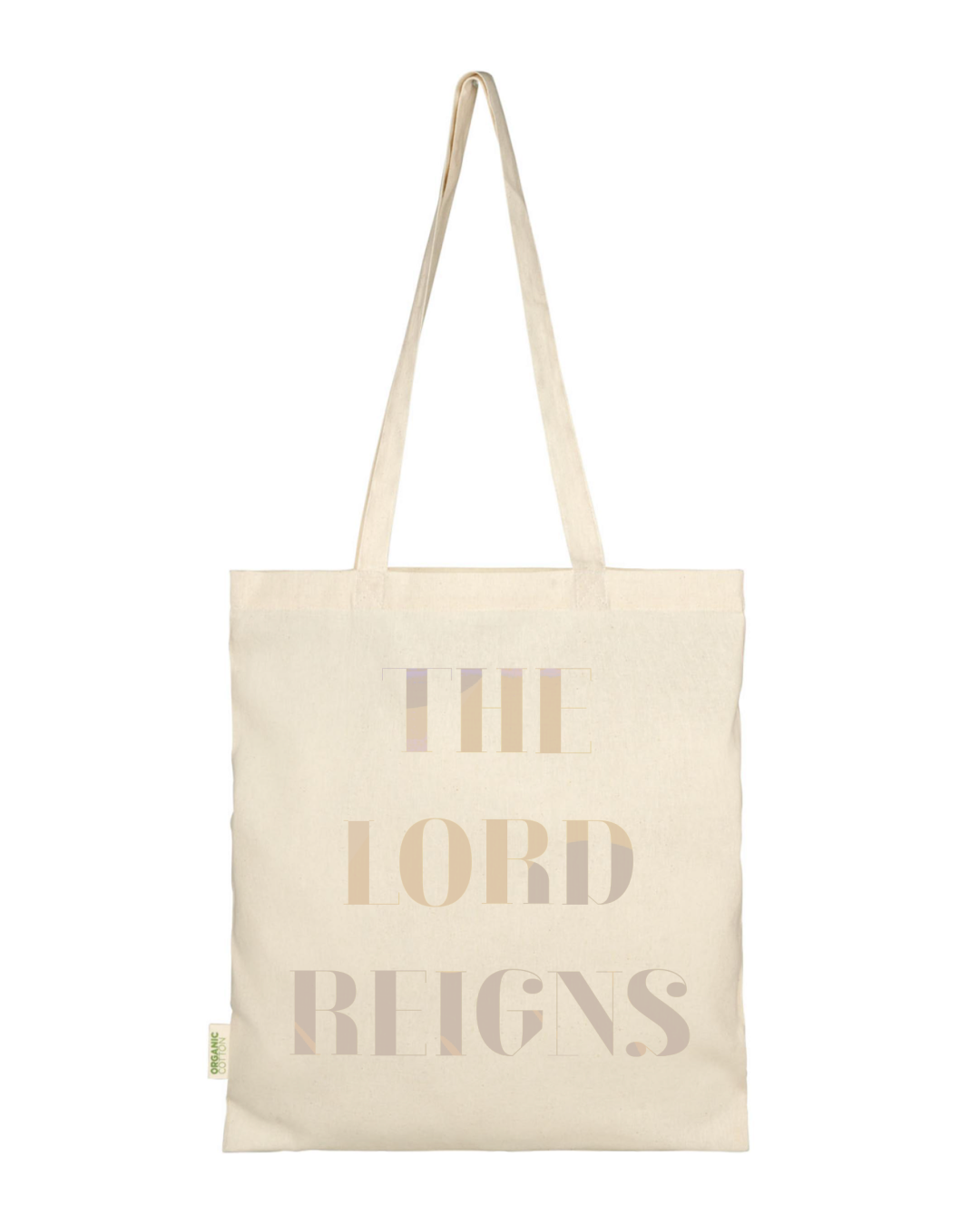 Naturfarvet bomuldsmulepose med Tekst 'The lord reigns'.