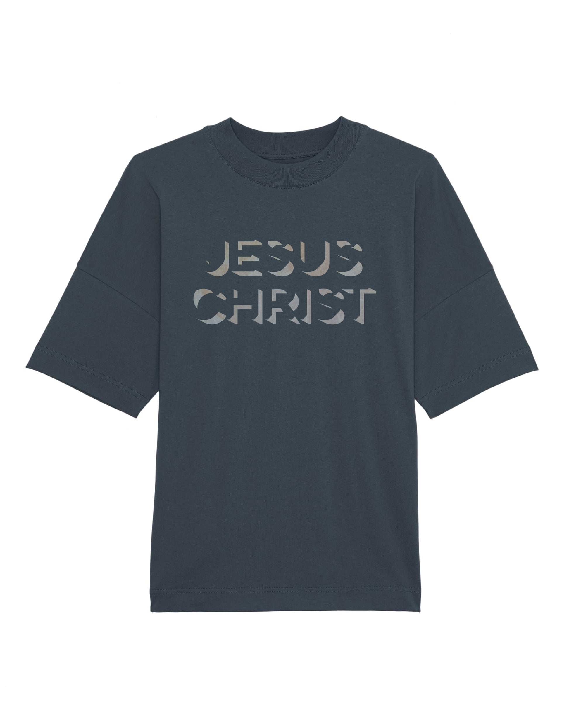 Oversize Navyfarvet T-shirt i økologisk bomuld, med teksten: 'Jesus Christ'.